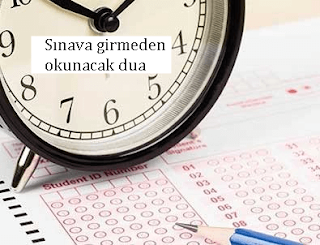"Allahummeftah lena ebvabe hikmetike venşur aleyna hazaine rahmetike ya zel celali vel ikram."Bu dua sınav öncesi akılda kalır kısa bir duadır, sınava girmeden önce okunacak ve sınava sağ ayakla sağ elle başlanılacak.